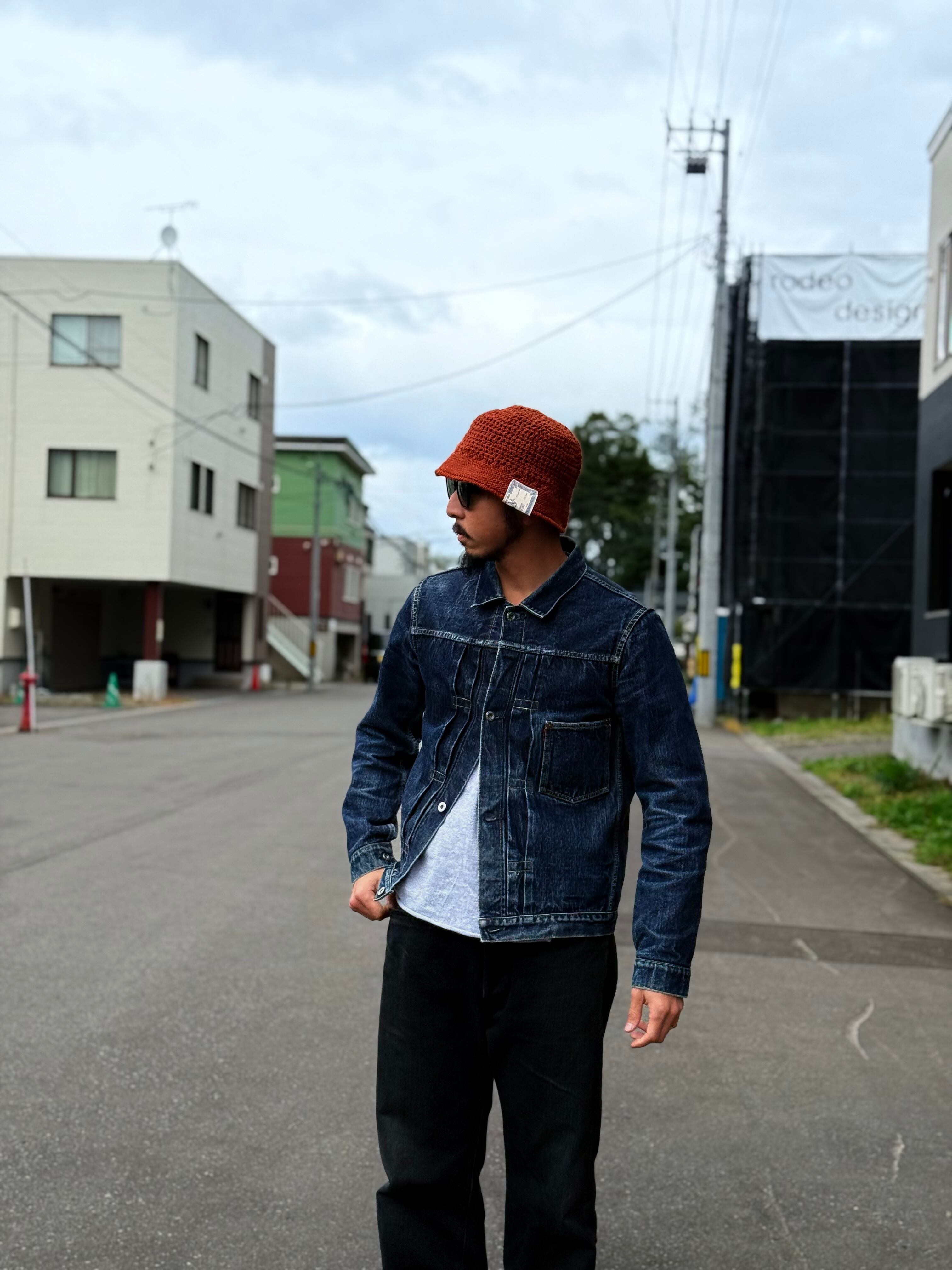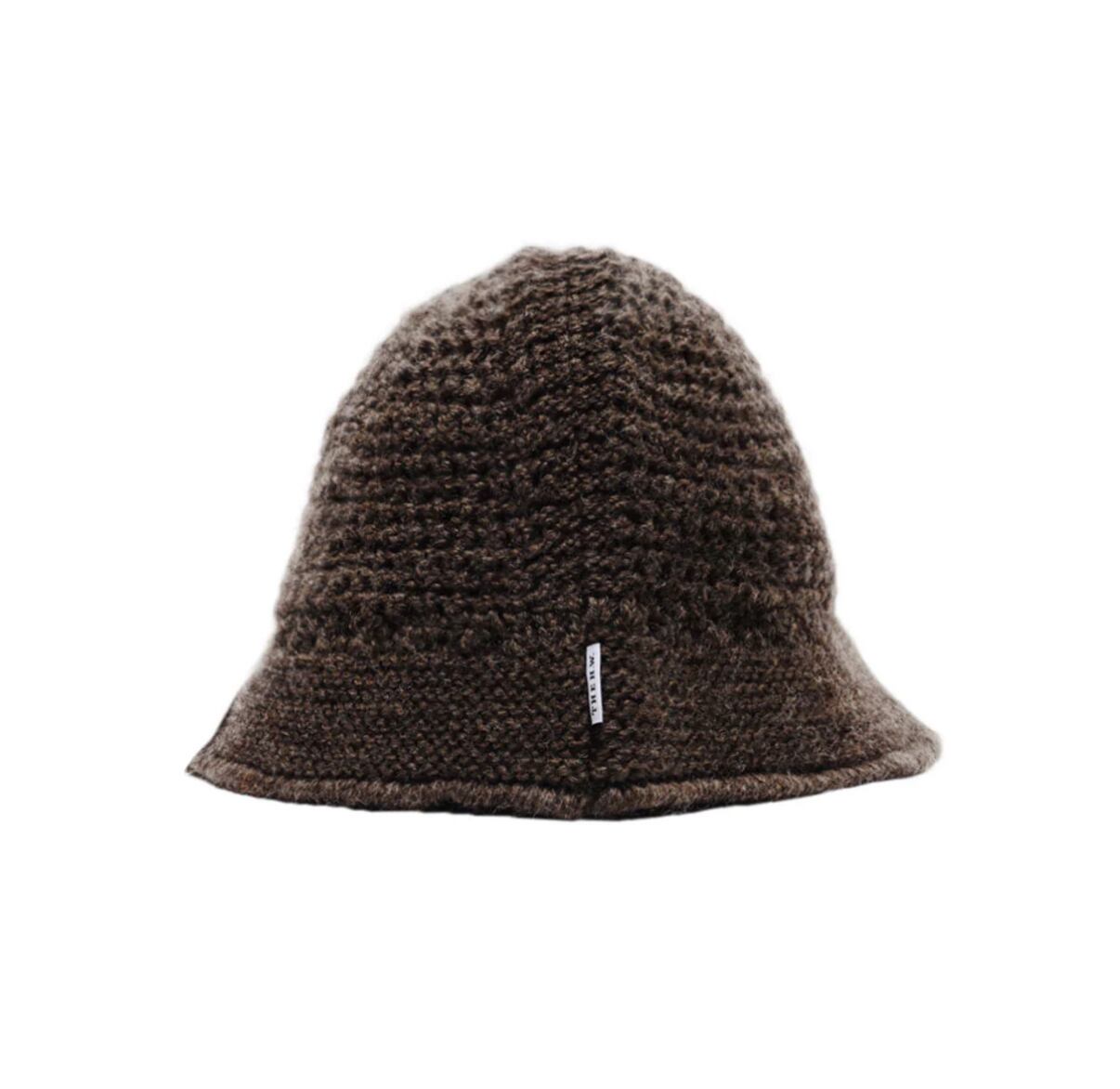 ローゲージで編まれたブリムがついたハット型ニット帽、通称クロシェハット。