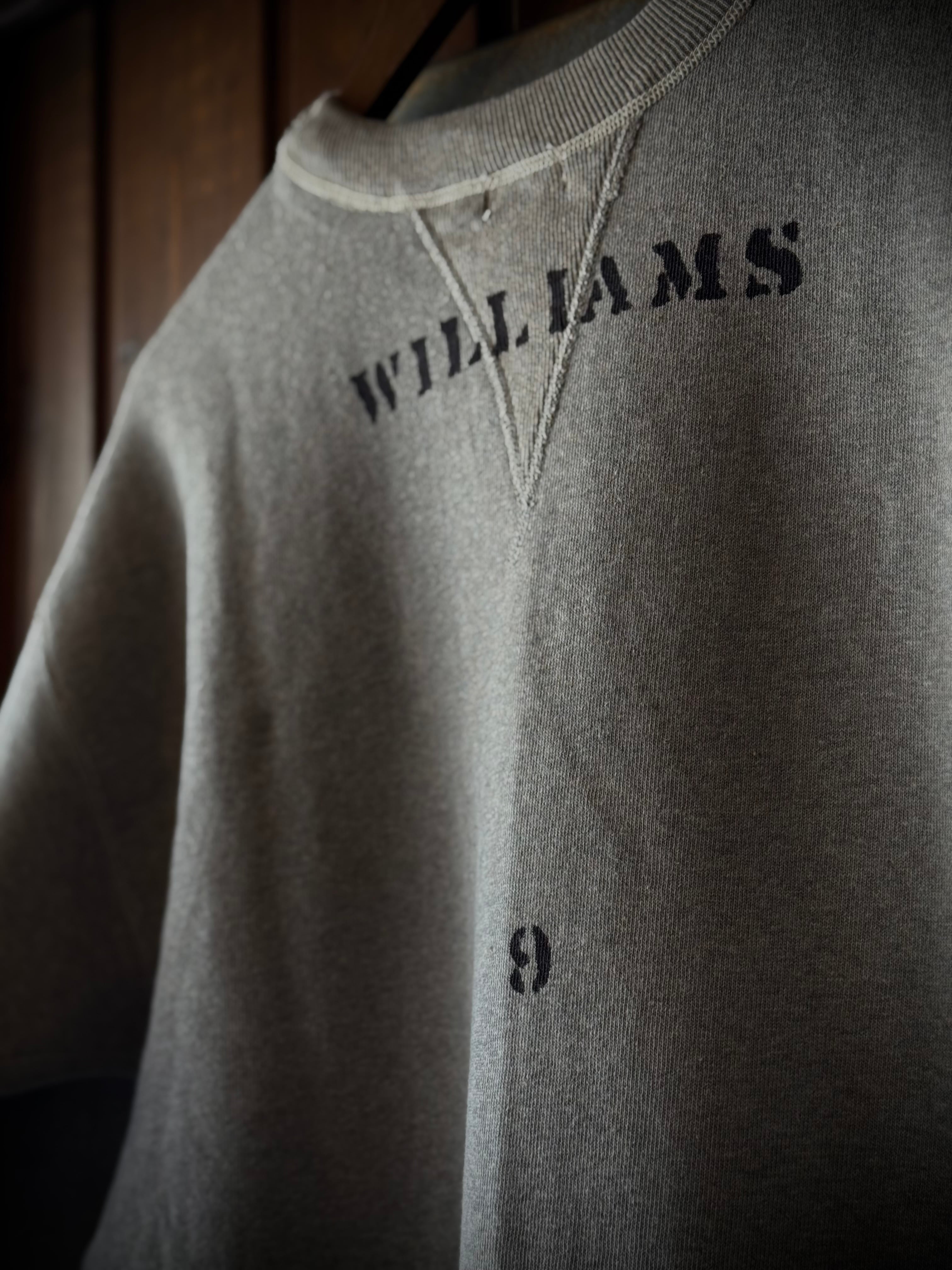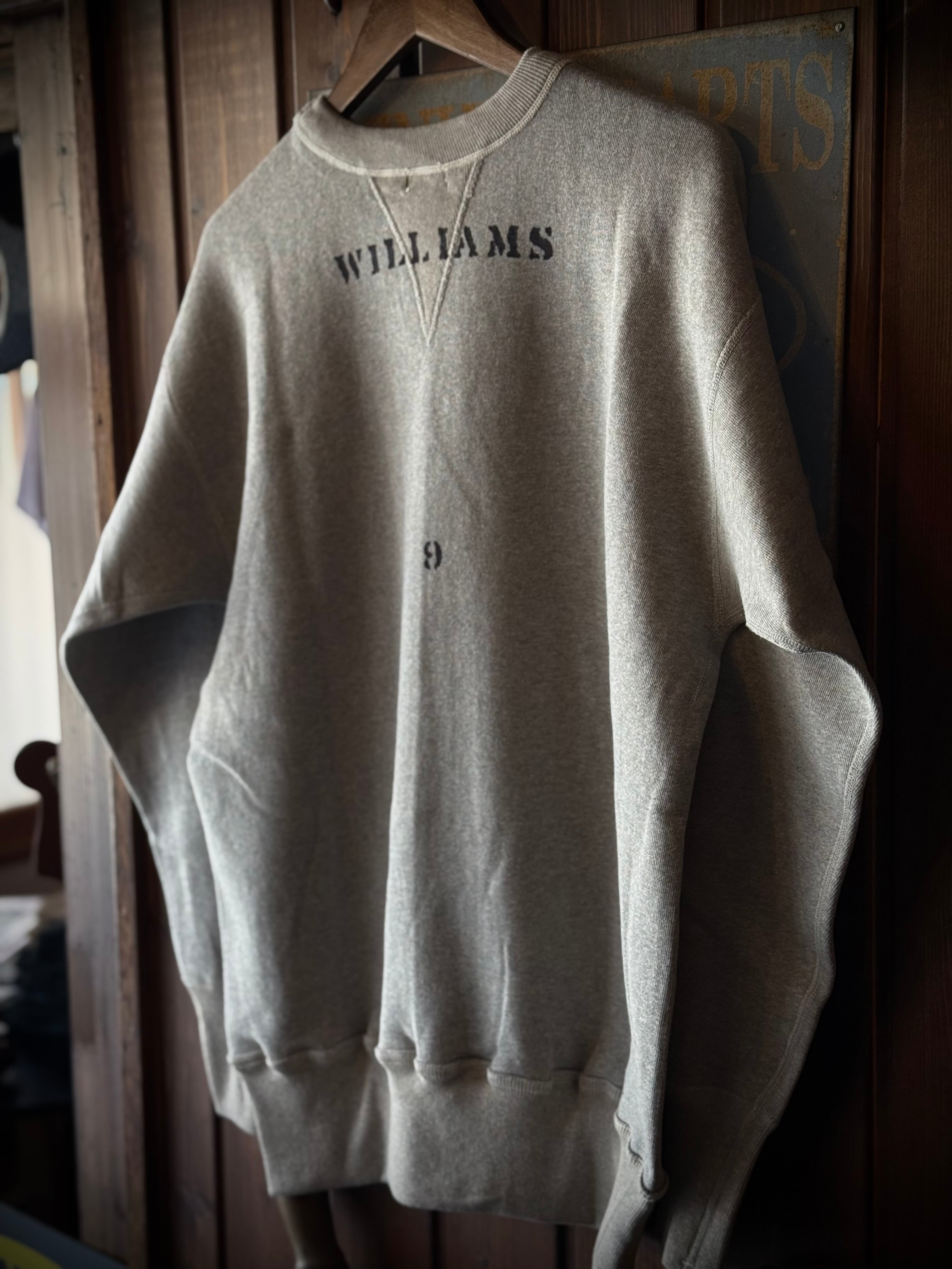 カットソーがウールからコットンに変わった1930年代からある挟み込み仕様の腰リブ。首まわりには伸縮に富むV字のフライスを前後に配した四本針仕様のスウェットです。肩口から垂直に落ちる袖口のセットインスリーブはややソリッドな印象を受けるシンプルなデザインですが、腰帯のバインダー仕様は着込むほどにアタリが生まれます。