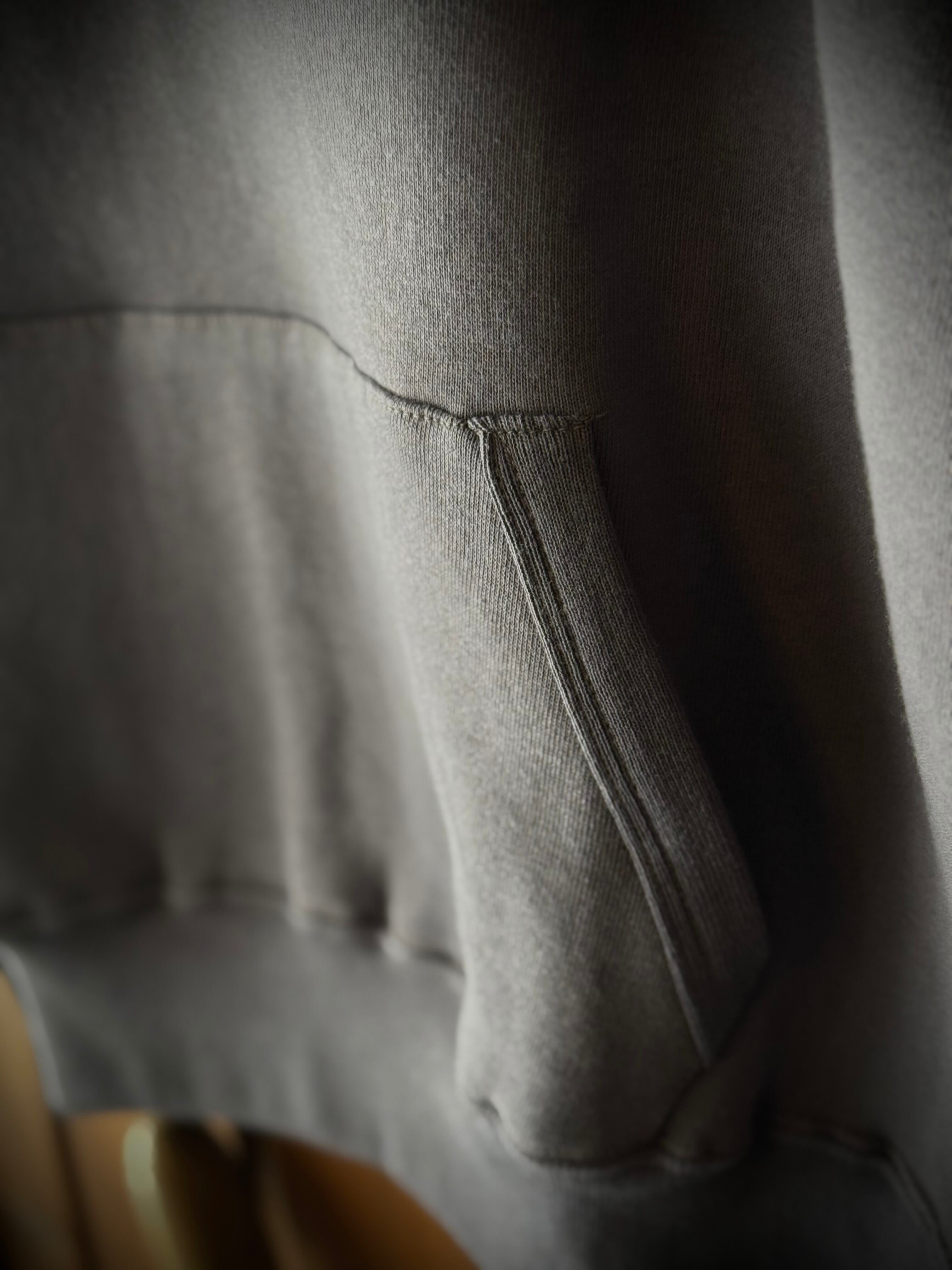セットインスリーブの二本針タイプのフード付きモデルです。不変的な定番デザインながら、フード裏、ポケット口には特徴的なフライスリブを使用しているため、フードはさらにフィット感を高め、フロントポケットはアクセントだけでなく、補強の役割も果たしています。