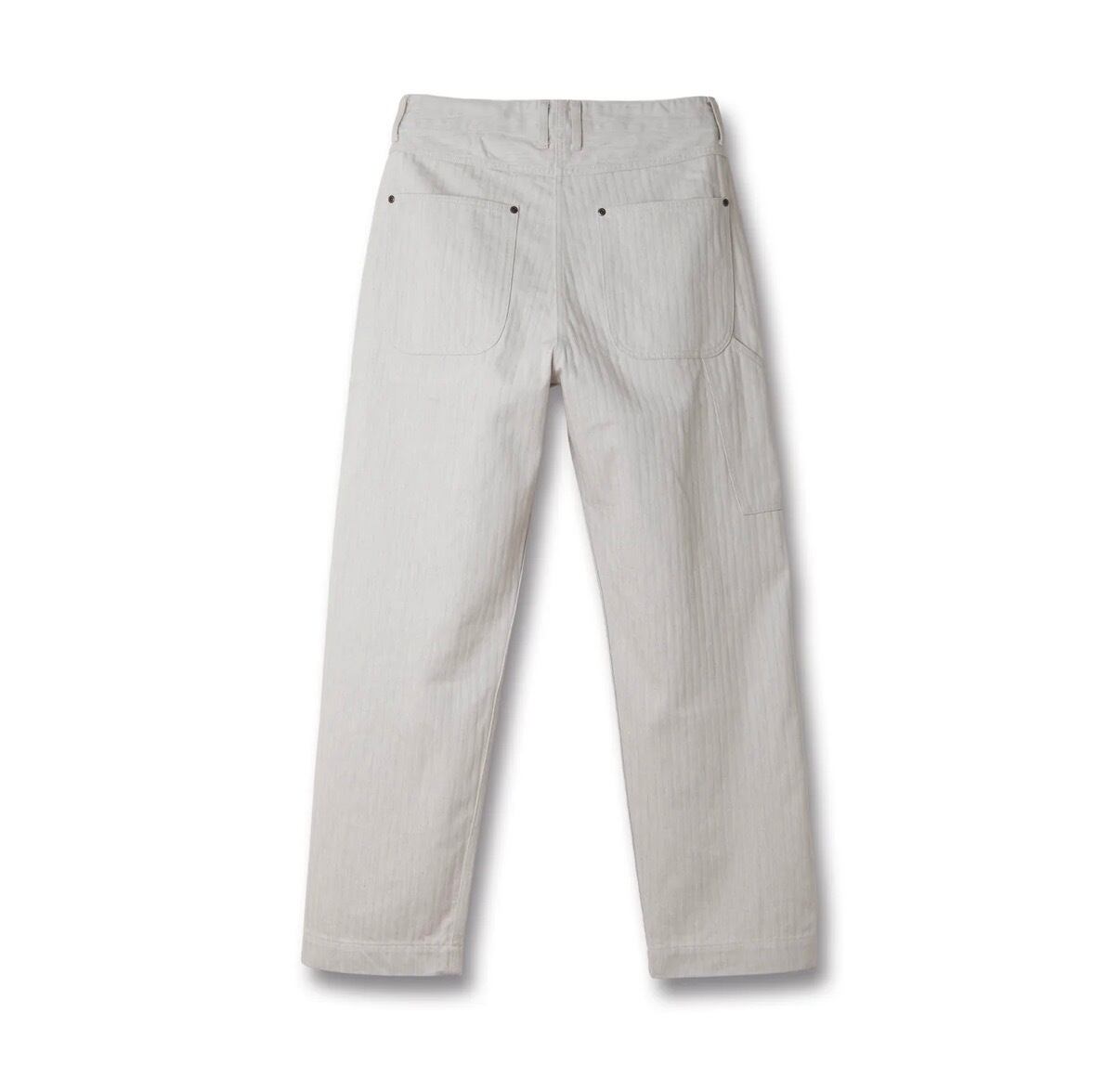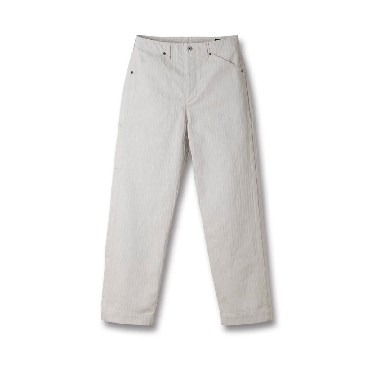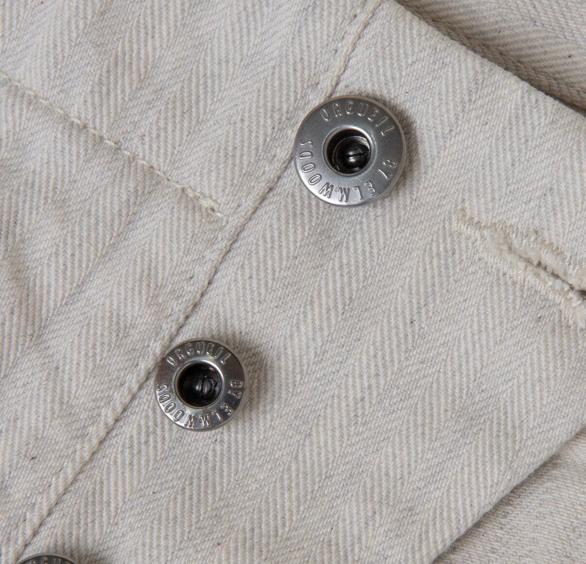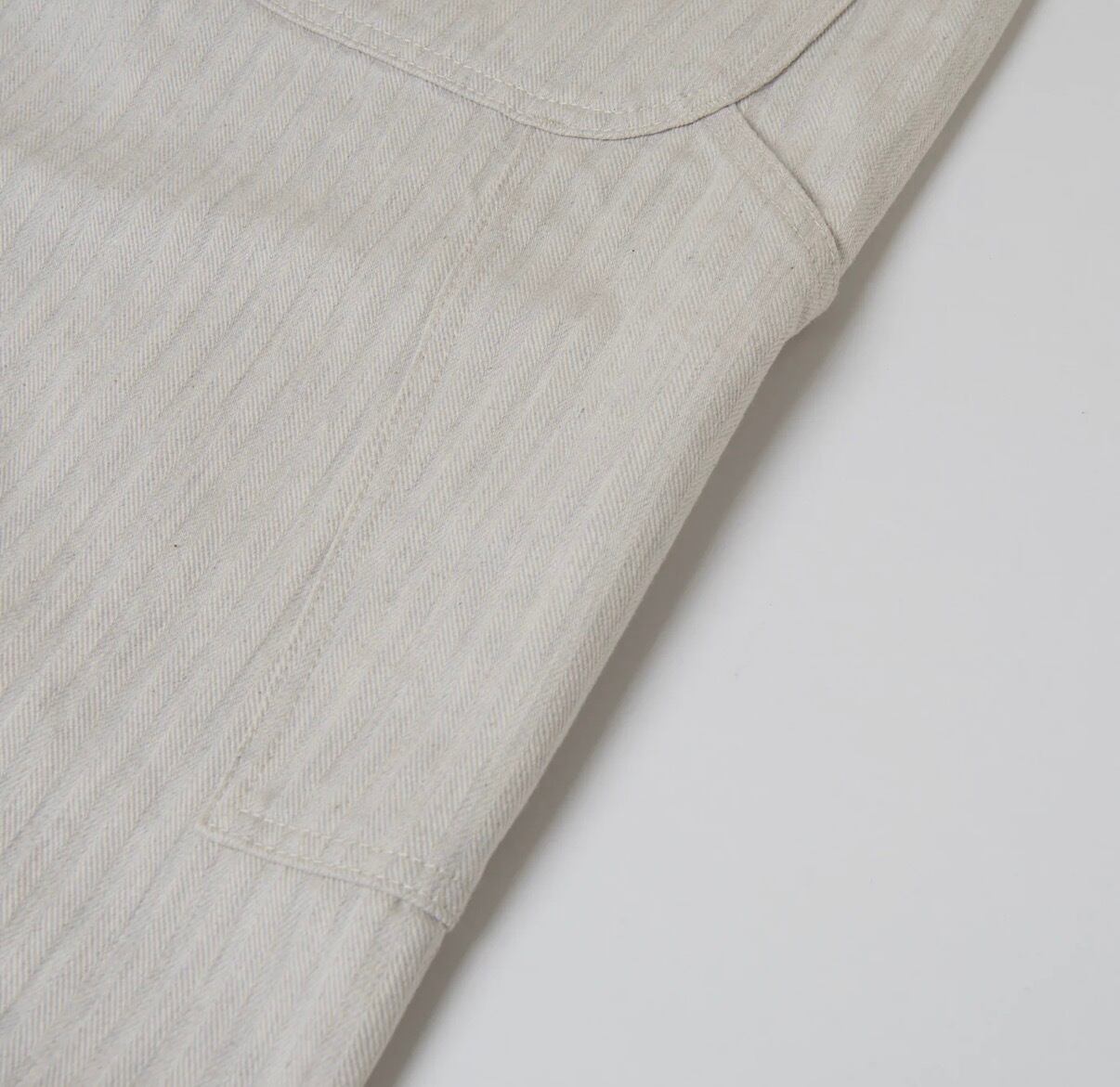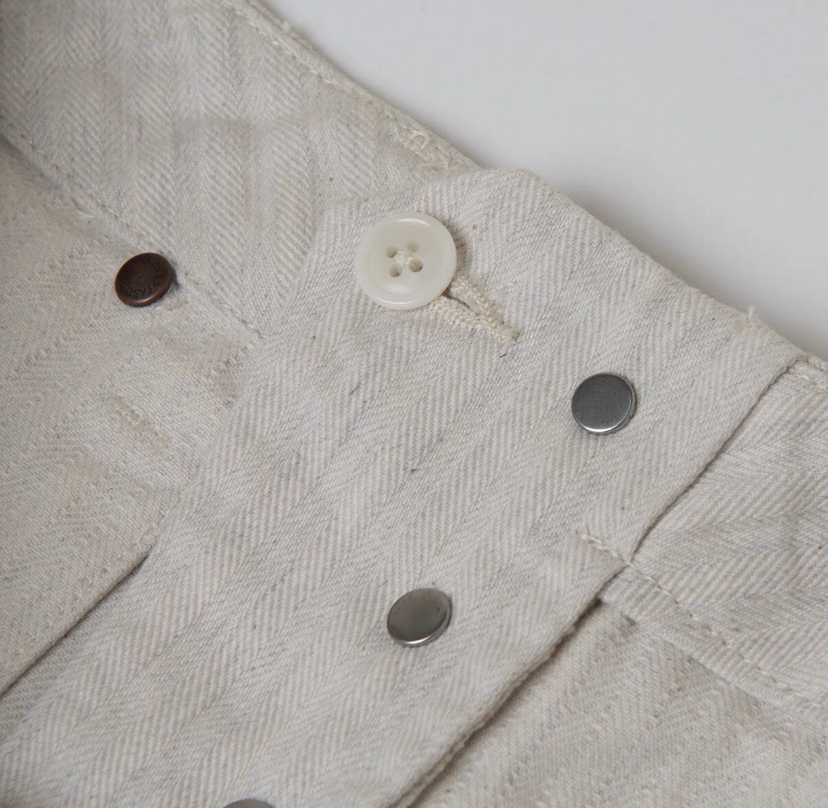 1940 年代のペインターパンツを参考にORGUEIL 独自に天狗仕様・比翼仕立てに仕上げ、よりクラシックなペインターパンツに仕上げました。細めピッチで味わいのある杢生成りのへリンボンを使用することでペインターパンツの重たいイメージを解消しています。
